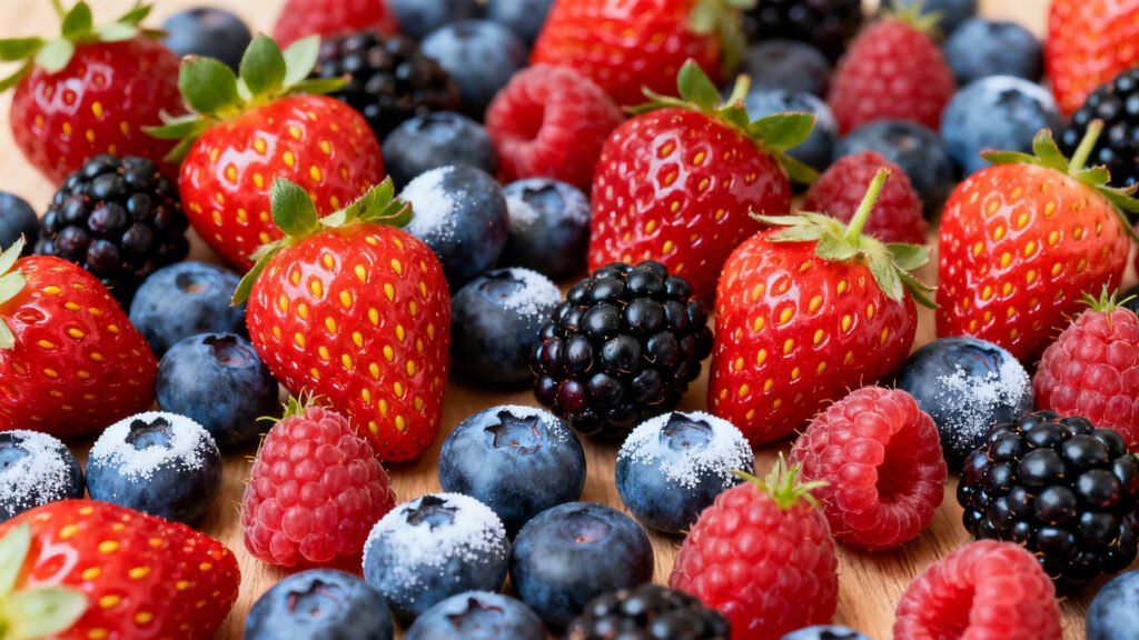 Berries such as strawberries, blueberries, raspberries, and blackberries are rich in fiber, vitamins, and antioxidants. They are low in calories, high in nutrients, and can support weight loss. They have low sugar, so they won’t cause blood sugar spikes. Enjoy them as a snack, in smoothies, or as a topping for yogurt.