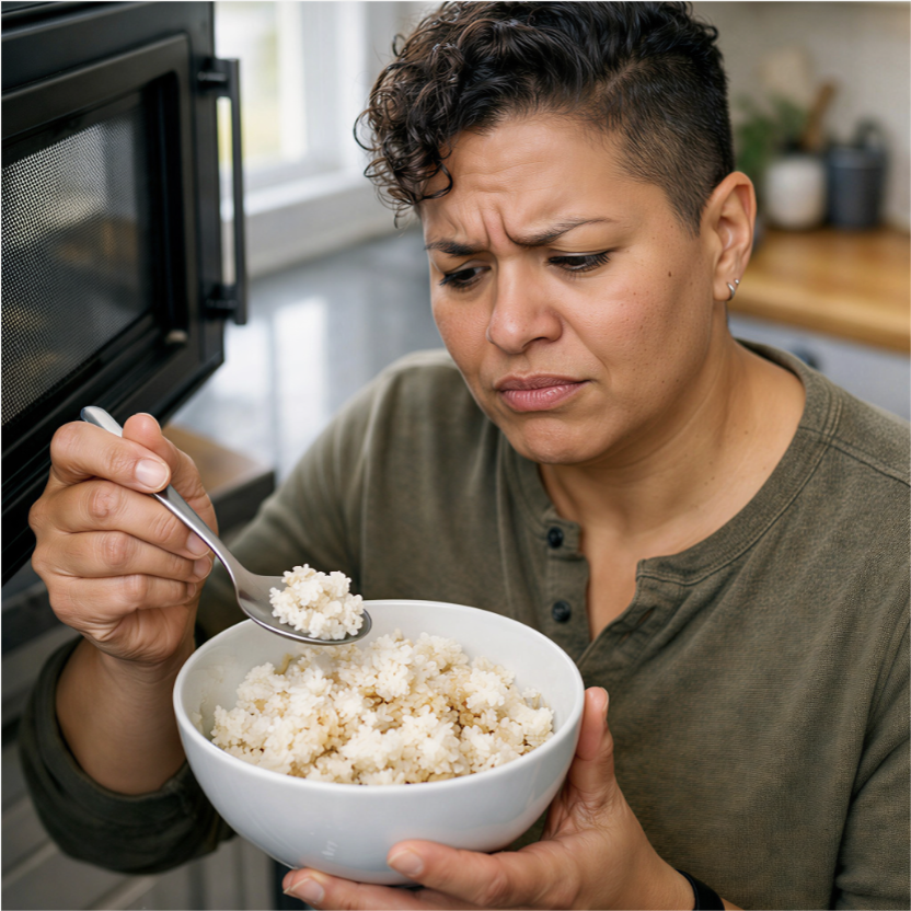 One of the most common mistakes is reheating rice without adding water. Stored rice naturally loses moisture, and microwaving it dry often results in hard, chewy grains.