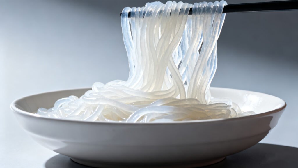 Konnyaku noodles, also known as konjac noodles and shirataki noodles, are translucent and gelatinous noodles that are commonly used in Japanese cuisine. They are made from konnyaku flour, which is derived from the konjac plant’s root. Konnyaku noodles have a unique texture that is chewy and slightly rubbery. They are often used as a low-calorie, low-carbohydrate substitute for regular noodles in dishes like stir-fries, soups, and salads.